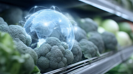 Infographic style, fresh veggies on racks, holographic globe above with glowing trade paths