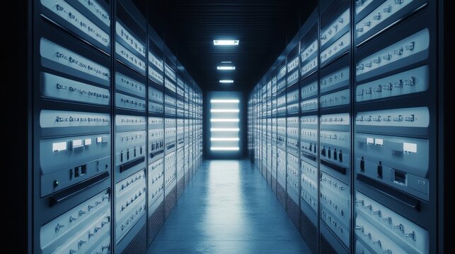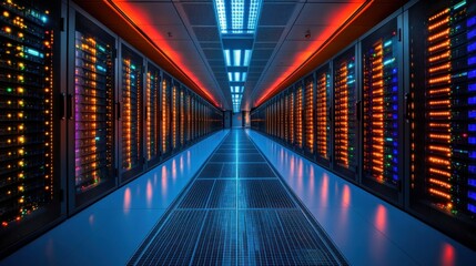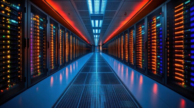 Futuristic Data Center with Rows of Server Racks and Glowing Lights