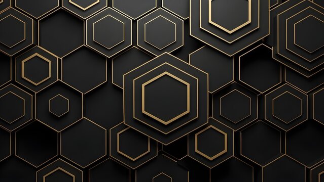 A refined geometric background featuring interconnected hexagon shapes in deep black with sleek gold borders