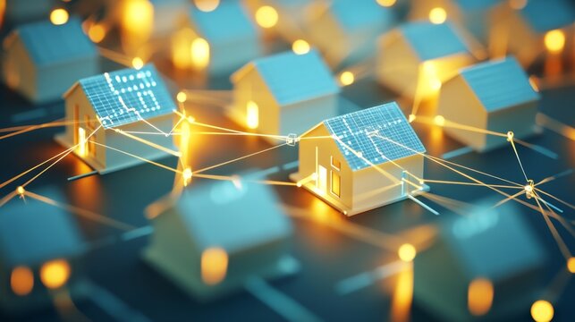 Solar power for community progress concept. Smart homes interconnected with solar panels at sunset.