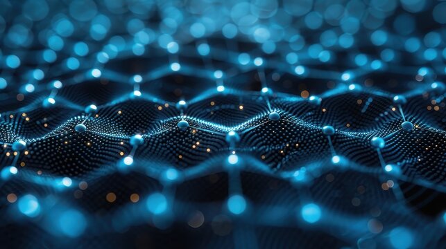 A close-up image of a graphene-like structure interconnected through nano-scale nodes, rendered with intricate detailing and bathed in blue and white hues.