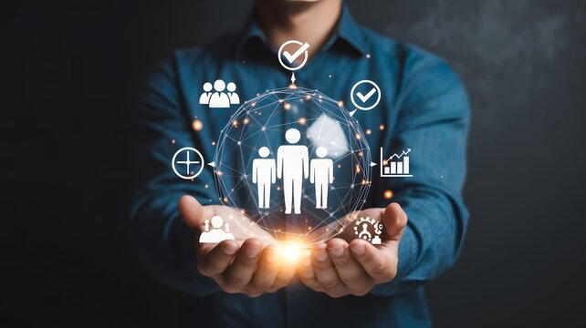 Person holding a glowing sphere with interconnected human and various symbols above it hands
