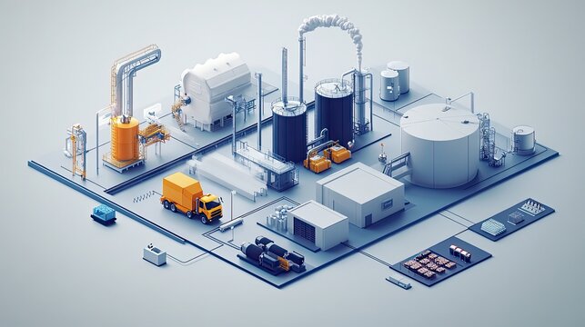 A stylized future industrial landscape showcasing energy processing with a delivery truck and interconnected systems