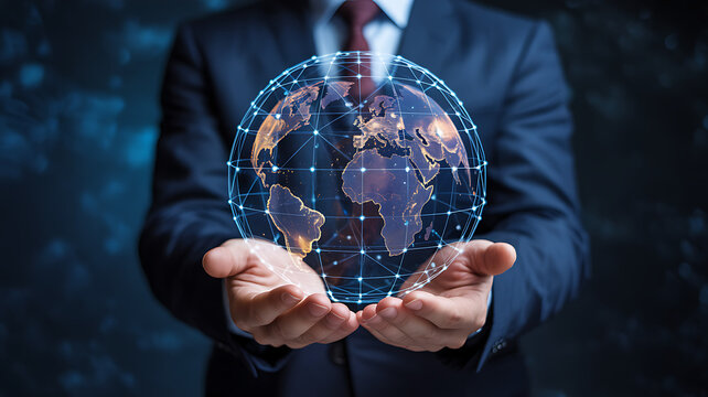 A global network map, highlighting interconnectedness and global reach, showcases a modern, digital world with glowing connections and polygonal representations of continents.