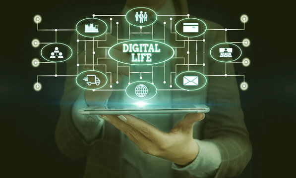 Word writing text Digital Life. Business photo showcasing Living in a world interconnected through Internet Multimedia Male human wear formal work suit presenting presentation using smart device