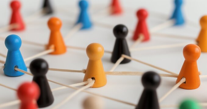 Networking concept; small wooden pawns representing individuals or nodes in a network with fine twine tied interconnecting everyone