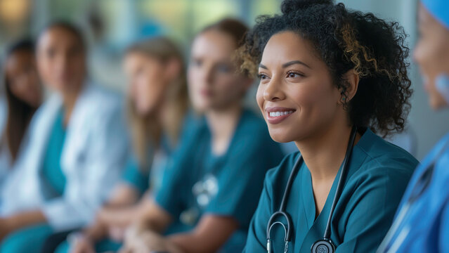A diverse group of smiling healthcare professionals, including doctors and nurses in scrubs, standing in a hospital corridor and exuding warmth and confidence.