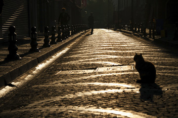 Silhouette of a cat on a cobblestone road interestingly lightened by the sun