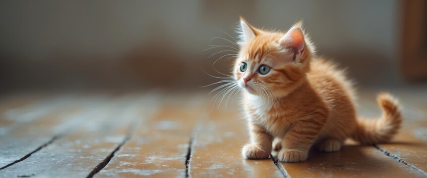 Small orange kitten sitting on a wooden floor looking curiously at its surroundings