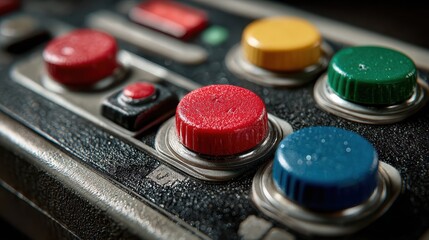 Bright buttons on a control panel show vibrant colors and clear labels while showcasing the design of a device used for various functions in a workshop or studio setting