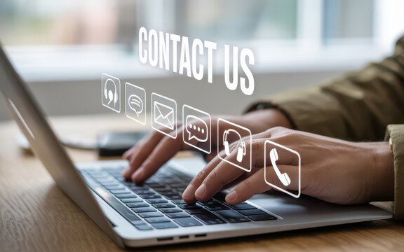 Digital customer service interface showing communication icons and a ""Contact us"" label above a laptop keyboard in an office environment