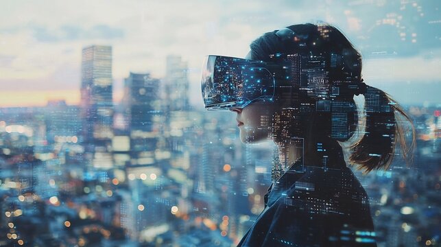 Marketer Viewing Augmented Reality Insights and AI Driven Marketing Strategies Over Cityscape