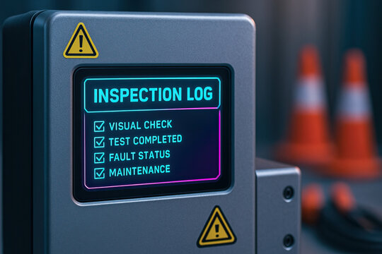 Industrial control panel inspection log visual check test completed fault status maintenance safety warning hazard symbol digital display checklist interface quality control equipment inspection