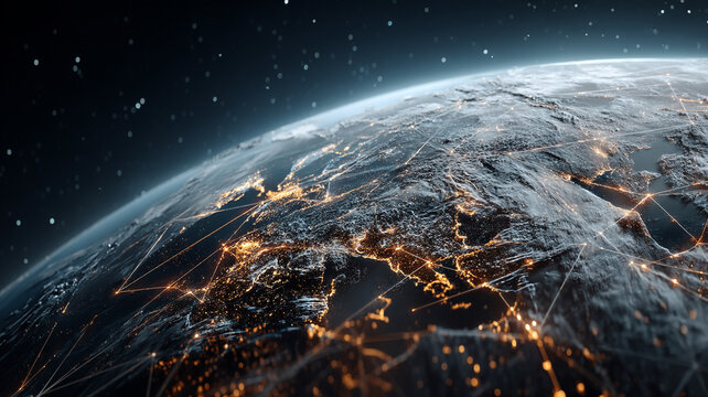 Earth at night showing glowing city lights and interconnected network lines above dark terrain