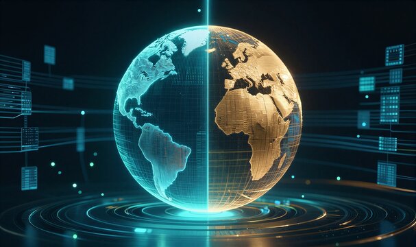 Futuristic holographic globe with blue matrix and data orbits