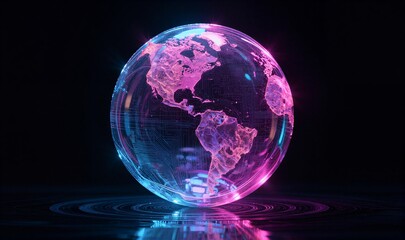 Rotating neon holographic globe with data grid and orbital trails in dark futuristic void