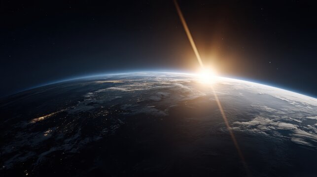 Orbital sunrise over futuristic metropolis with towering spire casting long shadow