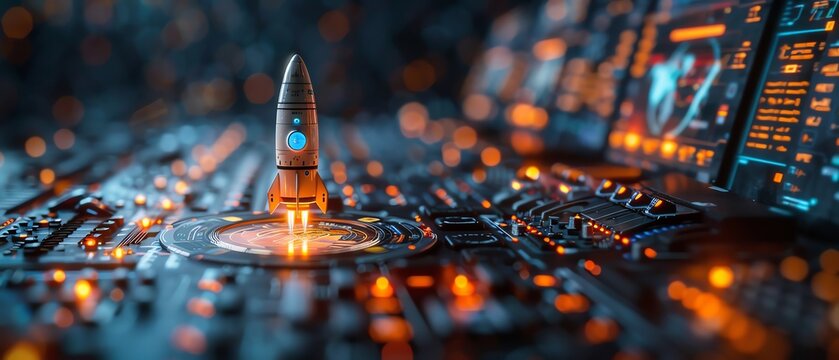 Small rocket model on a digital control panel with global maps and graphs, neon lights, futuristic and strategic