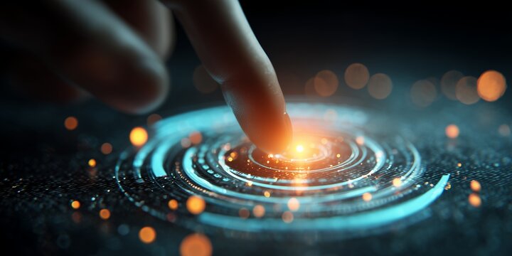 Close-up of a finger pressing on a futuristic digital interface with glowing lights and circular patterns. Concept for innovation, artificial intelligence and virtual reality