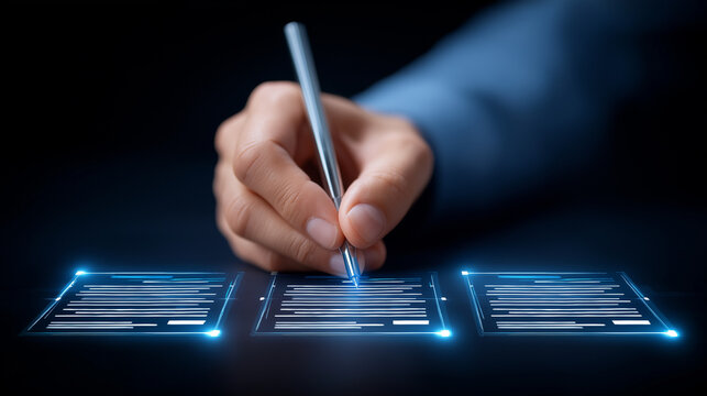 Futuristic Businesswoman Interacting with Augmented Reality Interface for Data Visualization and Digital Workflow Management