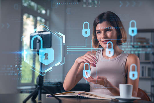 Woman explaining cybersecurity concept with digital lock icons overlay on blurred office background, showcasing data protection and privacy awareness..