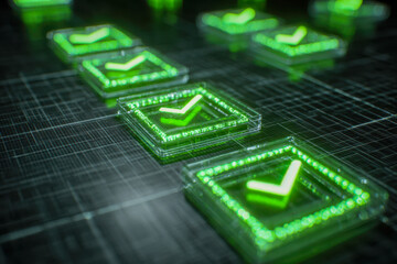 Futuristic digital interface featuring glowing green check marks in transparent squares symbolizing task completion and verification on a high-tech grid background