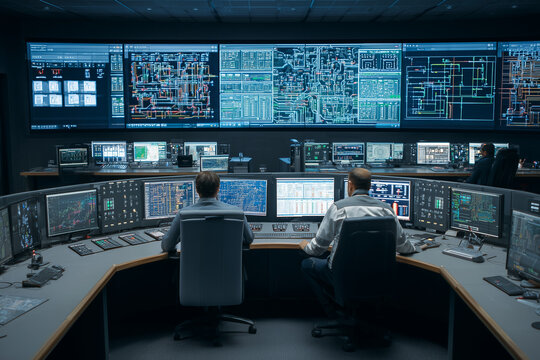 A futuristic control room of a high-voltage substation, engineers monitoring digital interfaces and energy flow maps,