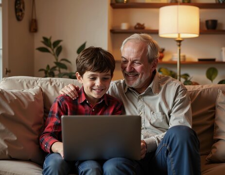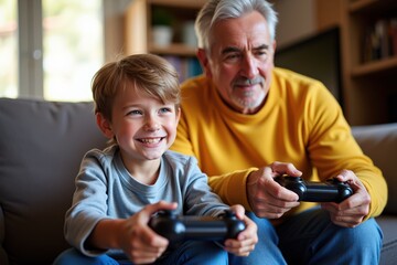Joyful Intergenerational Gaming: A Grandfather and Grandson Bonding Over Video Games and Controller Playtime in a Cozy Living Room