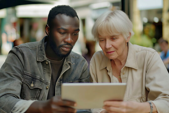 Young man helping elderly woman with technology. Bridging the generational gap through technology. Suitable for themes of digital literacy, assistance, and intergenerational relationships.
