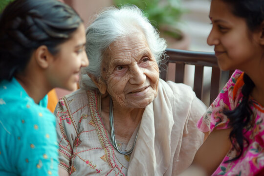 A portrait of woman sharing stories and wisdom with younger woman, showcasing intergenerational connections and empowerment.