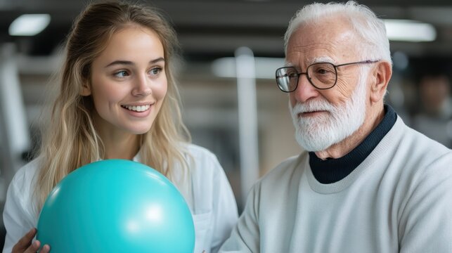 A young therapist supports an elderly man in a fitness setting, using a turquoise exercise ball, symbolizing vitality, care, and intergenerational support.