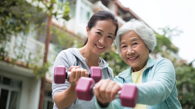 Active Asian Grandmother and Daughter Smiling while Strength Training Outdoors with Dumbbells, Promoting Senior Fitness, Health, and Intergenerational Support.