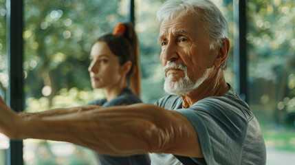 An elderly man and a younger woman focusing on stretching exercises in a gym, highlighting a moment of intergenerational bonding through physical fitness.
