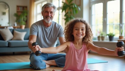 Intergenerational fitness motivation as young boy and elderly person exercise together holding blue dumbbells in bright indoor space