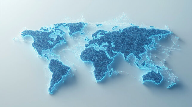 A radiant, digital world map, softly glowing in light blue against a bright white backdrop, symbolizing global unity and connectivity.