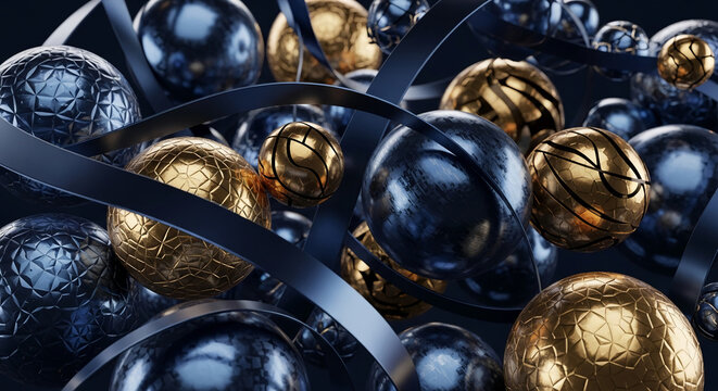 Abstract image of gold and dark blue metallic spheres interwoven with dark blue ribbons, creating a luxurious and dynamic composition suitable for design or presentation background