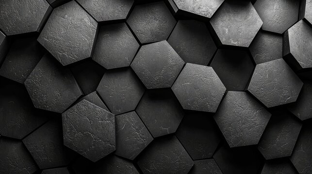 A textured surface of interlocking black hexagonal tiles, creating a modern, geometric design.