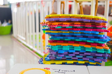 Protective foam floor tiles / mats inside a children's play room, kindergarten or gym. Potential use as a colorful background with copy space.