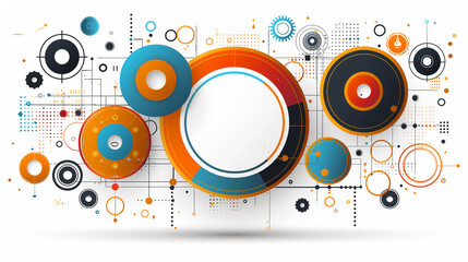 A colorful, geometric design featuring interlocking circles and lines in blue, orange, and black hues.