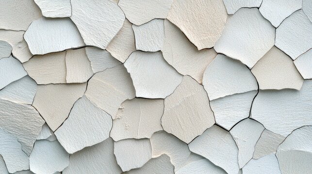 A close-up, abstract view of a wall or surface covered with irregularly shaped, interlocking stone tiles in shades of white and beige.