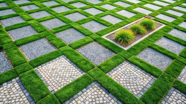 Mosaic pattern of green grass with interlocking grey stones in a modern garden design, stone, grassy,  stone