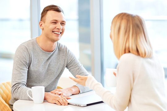 Handsome cheerful young bearded guy in glasses laughing from joke that hearing from his interlocutor on phone during working on laptop at home