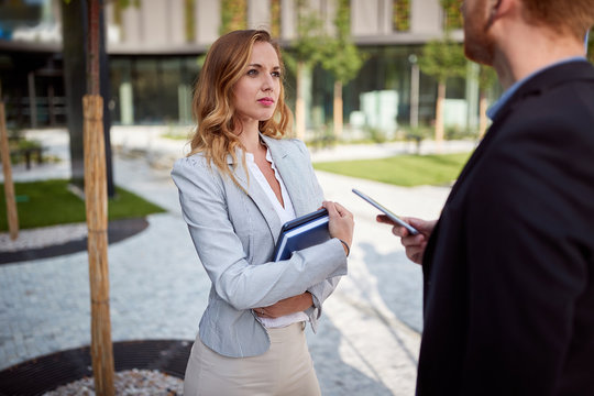 young caucasian businesswoman looking interested to her interlocutor outdoor in front of business building. outdoor, unofficial, meeting, sharing information