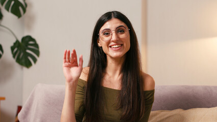 Brunette woman waves hand expressing warm greeting to interlocutor