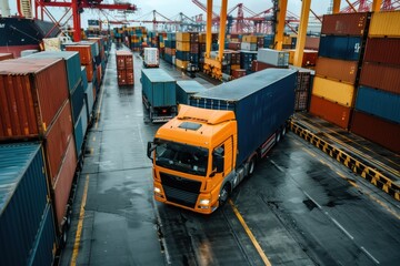 Shipping Container Terminal: Rows of stacked shipping containers form a vibrant, colorful corridor at a bustling container terminal under a bright sunny sky.