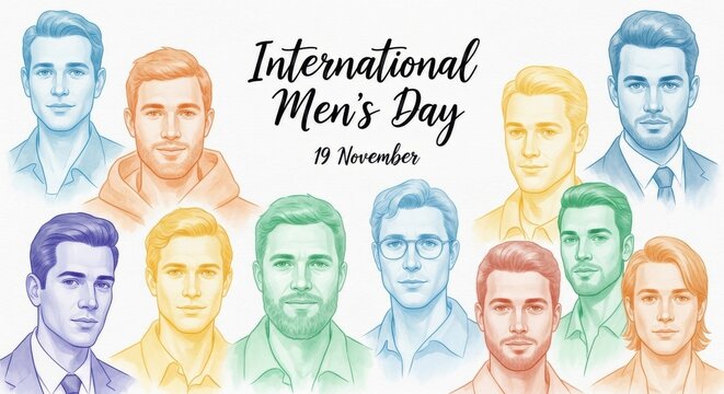 Group of diverse men celebrating International Mens Day, outdoors with smiles and unity, deep depth of field capturing every detail