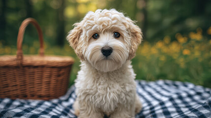 Adorable fluffy puppy on picnic blanket celebrates international dog day. Cute dog sitting in park with wicker basket and curious look