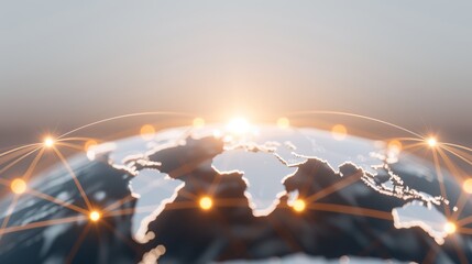 A digital globe illuminated with city lights and interconnected shipping routes, showcasing a vibrant, global trade landscape.
