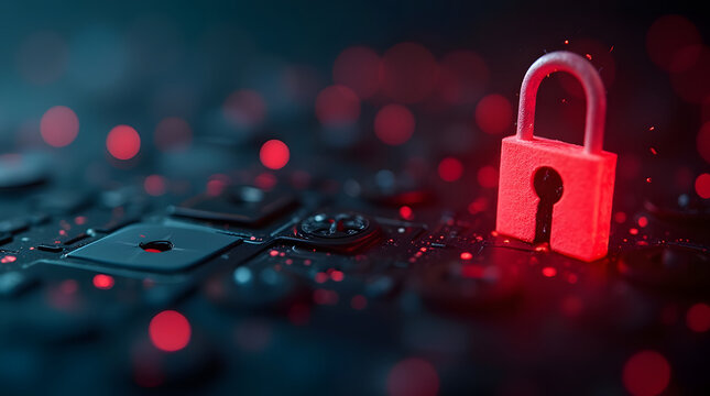 A computer desk with a red lock on a monitor. Cybersecurity concept