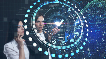 Standard quality control. Certification. Business, technology, internet and networking concept. Young businessman select the icon on the virtual display.